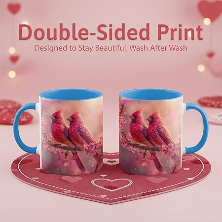 Farmhouse Spring Floral Red Cardinal Bird Couple Ceramic Mug 11oz with Romantic Cardinal Pair on Pink Cherry Blossom Branch, Nature Wildlife Art Coffee Cup, Gift for Couples and Bird Lovers
