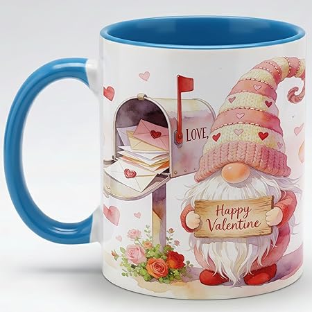 Valentine Gnome Ceramic Mug with Love Letters Mailbox Scene, Whimsical Coffee Cup Showing Romantic Mail Delivery Artwork, Cute Valentine Gift Mug for Her, Him, Wife, Husband or Couples